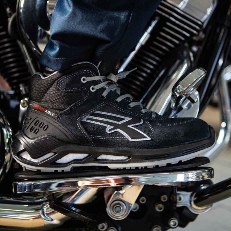 Scarpe antinfortunistiche alte, leggere e comode U-Power della linea Red 360, con tomaia in morbida pelle scamosciata forata, tallonetta anti-shock, puntale in alluminio, antiperforazione, antiscivolo e suola PU/PU infinergy.